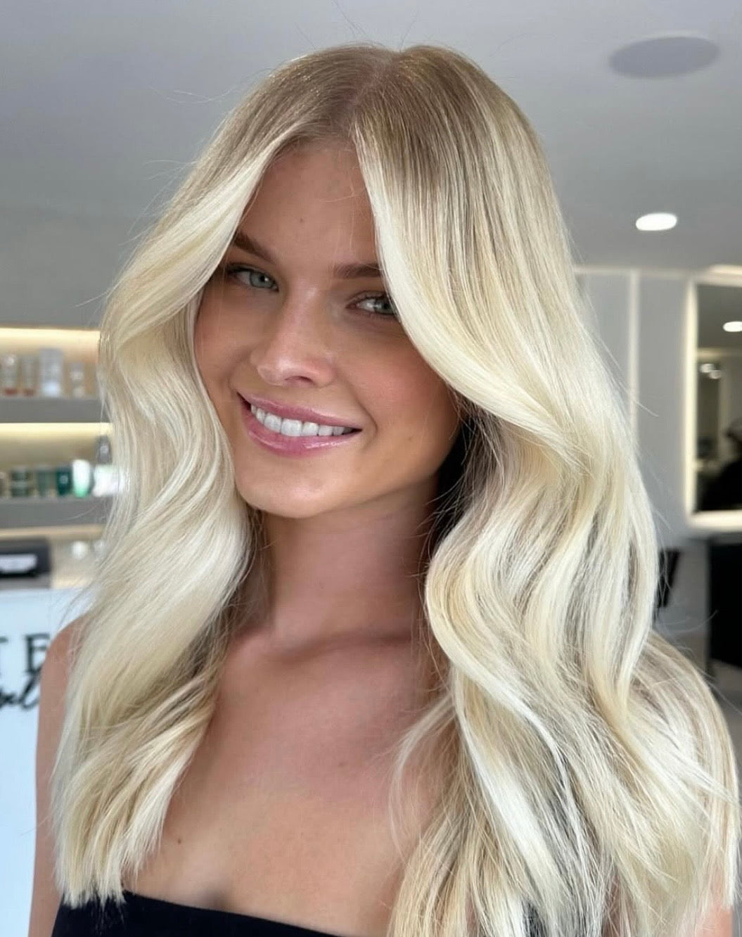 Butter Blonde is one of the most requested blonde shades right now. It’s a soft, creamy blonde that sits between cool platinum and warm golden tones, creating a bright yet natural look. The colour features slightly deeper roots that melt into glossy, pale blonde lengths for a smooth, dimensional finish.